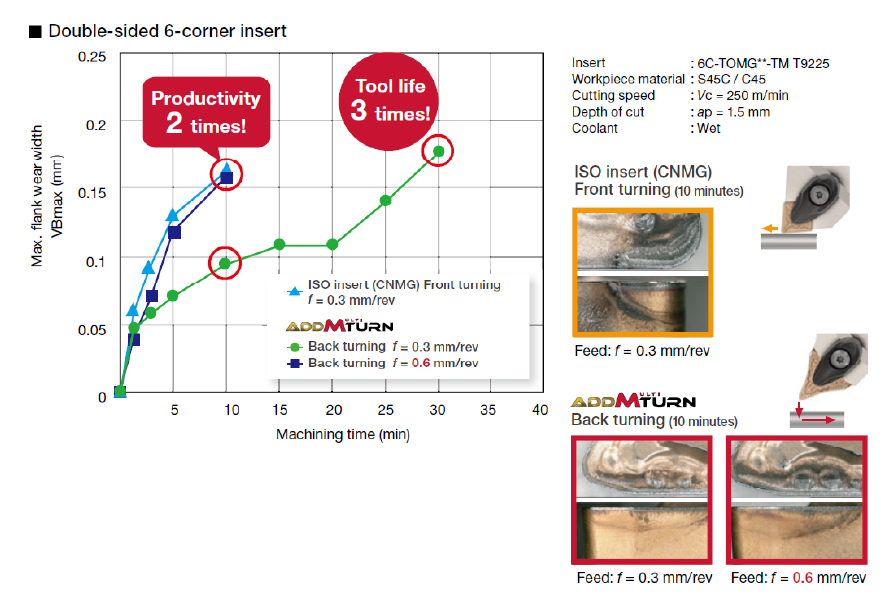 Double the feed rate with AddMultiTurn compared with ISO insert without compromising tool life.