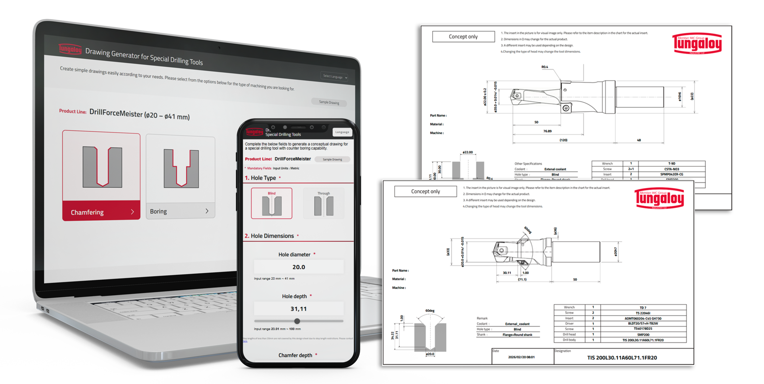 Tungaloy Corporation hat die Funktionalität ihres Zeichnungsgenerators für spezielle Bohrwerkzeuge erweitert, um die DrillForceMeister Produktlinie zu unterstützen, die nun Anfas- und Bohrspezialwerkzeuge abdeckt.