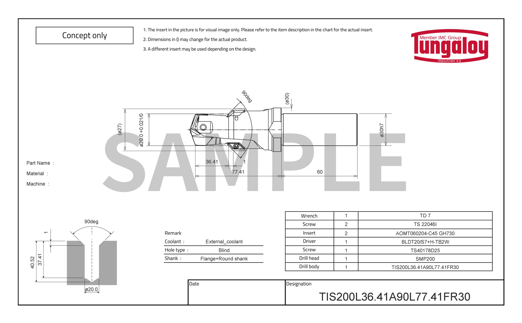 Note: This is a conceptual drawing, and the specifications of the final product may vary. Please share this drawing with your Tungaloy sales representative to confirm the actual specifications of the final product and to receive a quotation.