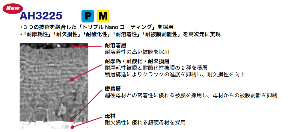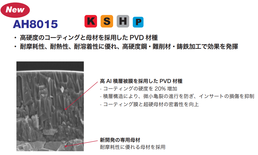 こうした課題に対し、汎用性と高い信頼性を両立したAH3225は、鋼・ステンレス鋼を中心とした安定加工を実現し、幅広い用途をカバーします。一方、鋳鉄、耐熱合金、焼入れ鋼などの難削材加工においては、優れた耐摩耗性を備えたAH8015のラインアップ拡充により、生産性の向上と工具コスト低減へのさらなる貢献が期待されます。