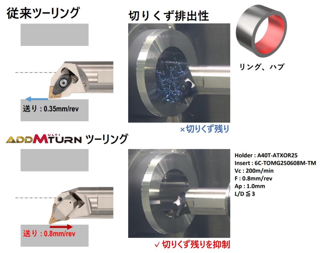 AddMultiTurnは、切りくずを「奥へ押す」のではなく「手前へ導く」考え方で使えるのが強みです。