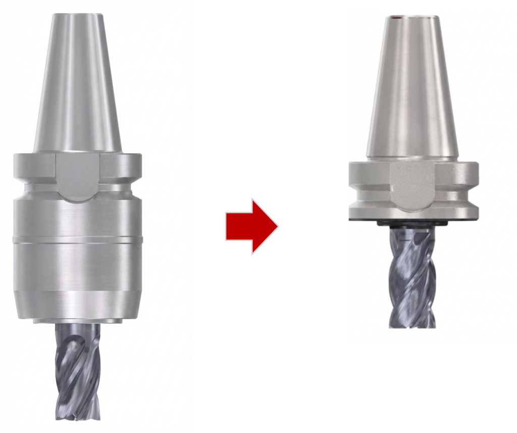 この組み合わせにより、通常のソリッドエンドミル+ミーリングチャックと比較して、突き出し長を大幅に短縮できます。