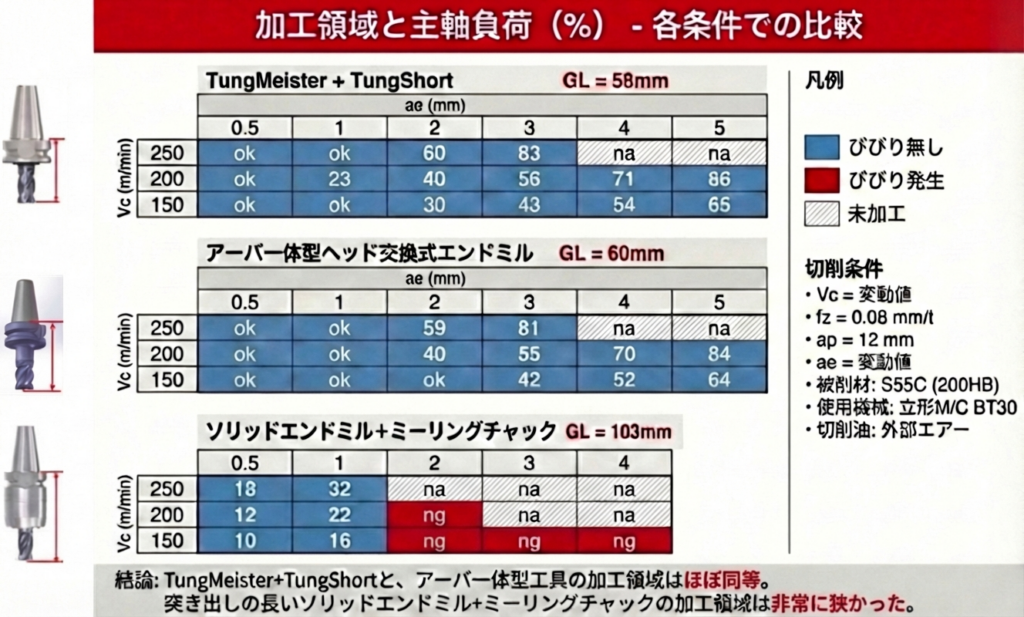この結果から、突き出し長を短くすることの重要性と、TungMeister+TungShortがアーバ一体型工具に匹敵する性能を持つことが実証されました。