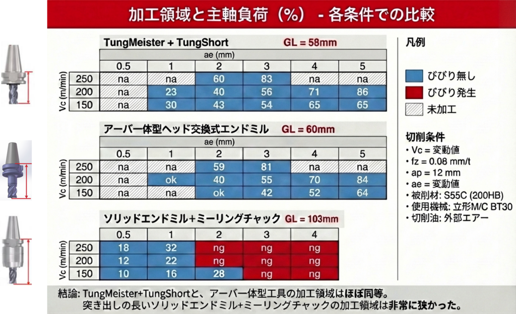 この結果から、突き出し長を短くすることの重要性と、TungMeister+TungShortがアーバ一体型工具に匹敵する性能を持つことが実証されました。