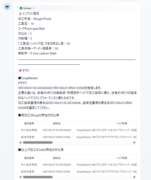 工具選定は、これまで経験と知識が必要な専門的な作業でした。Tungaloyのエンドミル選定AIアシスタントは、ソリッドエンドミルとTungMeisterを横断的に比較・選定し、誰もが最適な工具と切削条件にたどり着ける新しい体験を提供します。