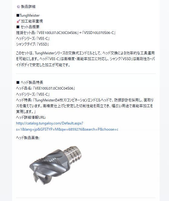 TungMeisterはヘッド交換式エンドミルであり、「ヘッド」と「シャンク」の2つのコンポーネントで構成される工具体系です。AIアシスタントは、従来は手動で行っていたヘッドとシャンクの組合せ検証を自動化します。