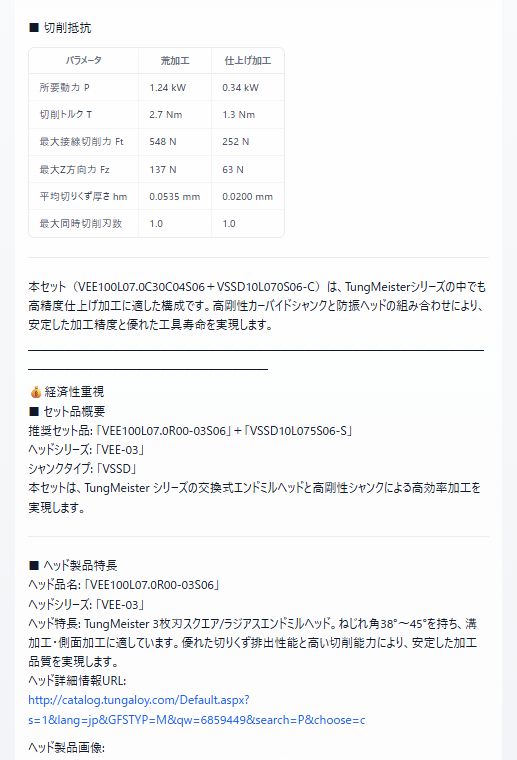 選定された製品情報、推奨される切削条件、切削抵抗が見やすい表形式で表示され、技術者が一目で理解できます。ソリッドエンドミルとTungMeisterの候補を横断的に比較できます。