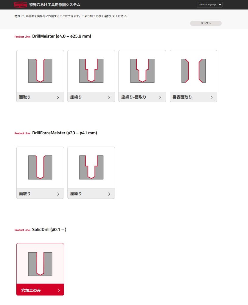 本システムでは、超硬ソリッドドリルの特殊径/長さ仕様に対応し、ツイストドリルと直刃ドリルの選択が可能です。