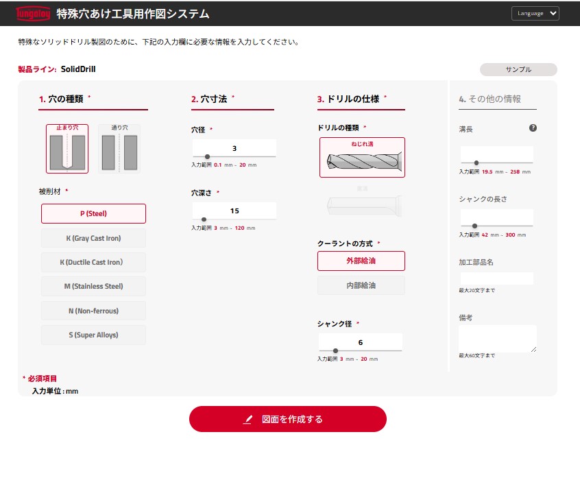 本システムは、超硬ソリッドドリルの特殊径/長さ仕様に対応し、ユーザーの加工条件や用途に応じた工具構想図をスピーディーに作成できます。