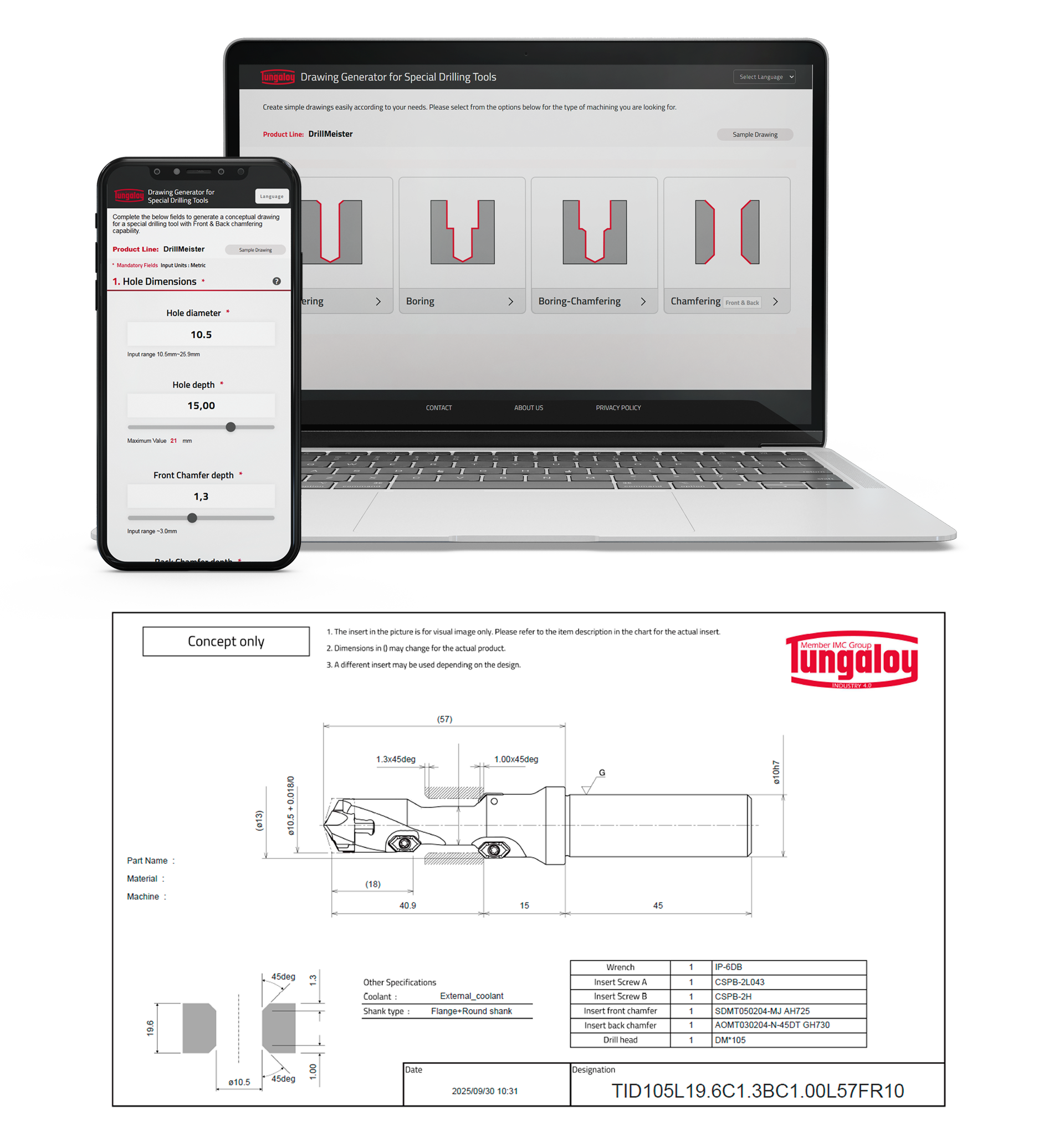 Корпорация Tungaloy расширила функциональность своего генератора чертежей для специальных сверлильных инструментов, добавив новую опцию Фасочные спереди и сзади.